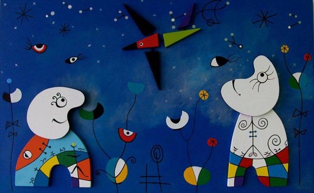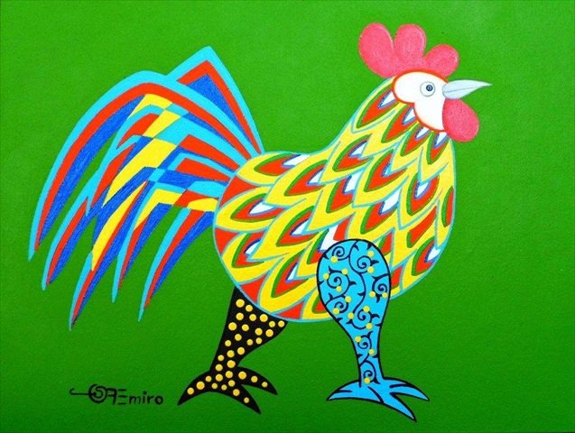 Y el gallo, presentado en series, parece sonreírnos mientras picotea y retoza, o canta, y es tal como su creador lo bautiza” De raza Fina” al hacerse espacio de lunas, globos, jardín florido, pero, siempre lunas y estrellas de colores: verde azul, rojo, blanco.